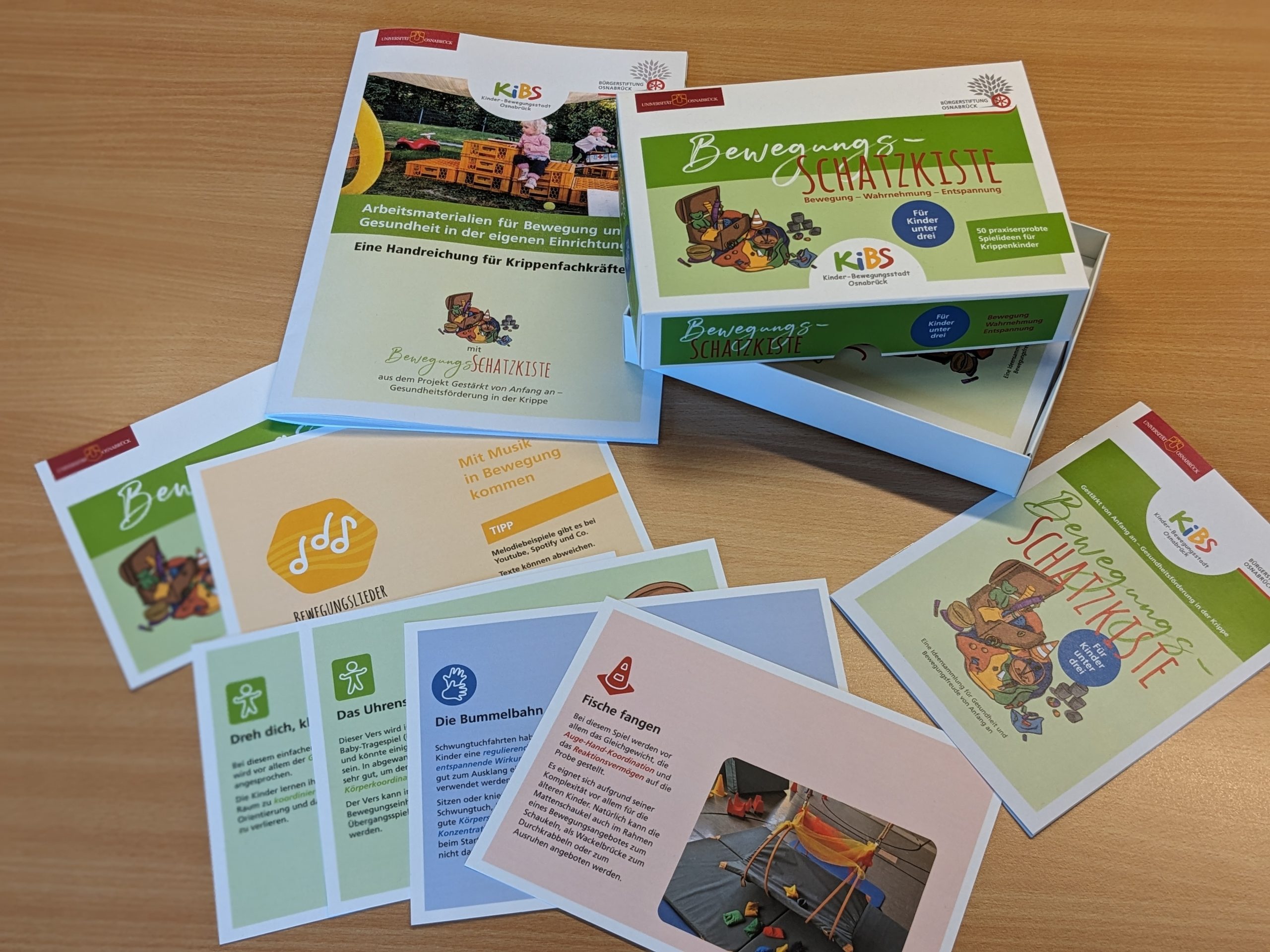 Im Rahmen unseres Projekts Gestärkt von Anfang an wurden mithilfe der drei Projektkrippen altersgerechte Angebote erprobt, gesammelt, angepasst und die besten Angebote zu einer bunten Sammlung von „Best-Practice- Beispielen“ zusammengefasst. Die Kartensammlung umfasst nicht nur zahlreiche Bewegungs- und Wahrnehmungsspiele sowie Lieder und Spielstationen, sondern hält auch Anregungen und hilfreiche Tipps für die Umsetzung im Krippenalltag bereit. Ergänzend hierzu wird eine Handreichung mit den Erfahrungen aus der Projektzeit zusammengestellt, die es anderen Fachkräften und Krippen ermöglichen soll, sich zu einer bewegungs- und gesundheitsanregenden Einrichtung weiterzuentwickeln.